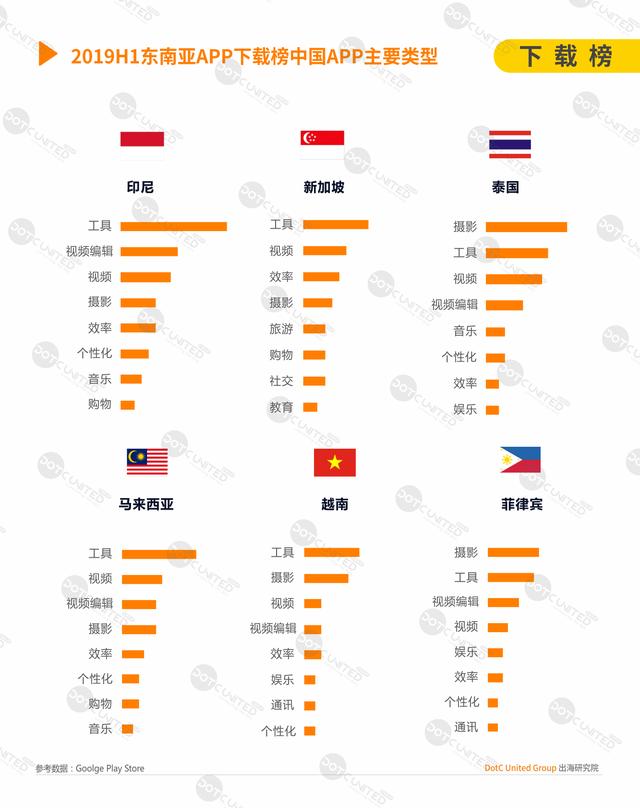 统计Google Play Store下载榜TOP200中中国APP类型结果显示,整体而言,来自中国的APP基本集中在工具、摄影、视频(直播、短视频)和视频编辑等类型。从个性上来看,印尼用户对于中国的视频编辑类APP、泰国和菲律宾用户对中国的摄影类APP表现出了更加明显的偏好。
