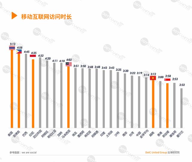 根据we are social最新数据显示,东南亚国家的移动互联网用户访问时长比西方和东亚国家花费的时间要高出很多,东南亚六大市场的移动互联网每日访问时长均位居全球TOP25,其中,泰国是全球移动互联网每日访问时长最长的国家,超过5小时,菲律宾和印尼也在4个半小时以上。移动互联网用户访问时长是考量用户与APP会话活跃度的重要指标,东南亚APP市场的巨大能量可窥一斑。