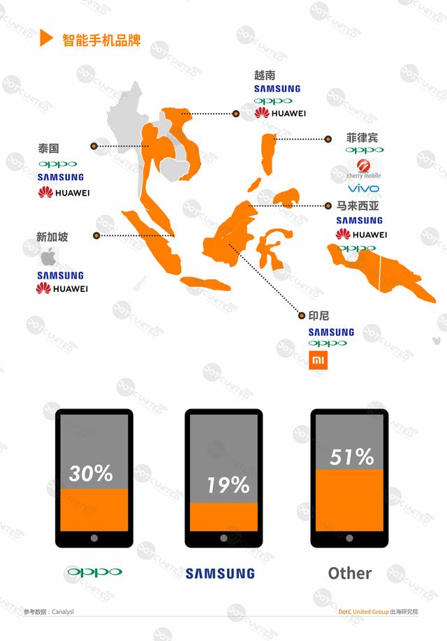 目前,在东南亚六国中,新加坡作为东南亚国家中唯一的发达国家,以高端机主导市场,苹果用户接近四分之一市场份额。除新加坡外,其他东南亚市场基本以三星、oppo、华为、vivo及小米等安卓手机为主。其中,三星和oppo合占整个东南亚手机市场约50%市场份额。对于在东南亚市场的APP分发,不论是手机预装或是应用商店分发,国内厂商可参考这些信息进行与相关手机厂商的合作。