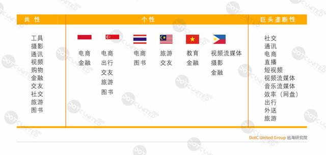 目前在东南亚市场,中国的工具、视频(包括直播和短视频)、视频编辑以及图书类APP数量占各自类型超过50%市场份额。此外,摄影、个性化等产品也有较高的市场份额。同大多数市场一样,对与本土密切相关的服务或咨询等类型产品基本都是本土APP覆盖居多,由于地理文化等壁垒,海外APP在这些领域的拓展方面仍存在困难,如地图导航、交通出行、天气、餐饮等类型。