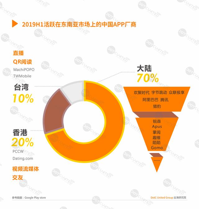 中国香港和台湾地区的APP厂商,除了供应本土市场外,东南亚地区也成为了他们的主要目标市场。目前,来自香港的视频流媒体、交友类等应用,以及来自台湾地区的直播、QR阅读类等应用在东南亚市场都表现不俗,实力不容小觑。