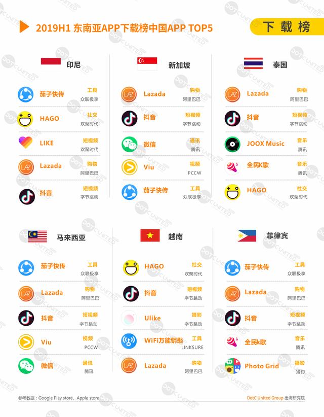 统计2019年上半年东南亚六国APP下载榜中中国APP TOP5显示,整体而言,中国APP头部产品主要集中在购物、短视频、音乐流媒体和工具等品类,其中,购物APP Lazada、短视频APP抖音以及传输工具茄子快传是表现最好的三款产品。