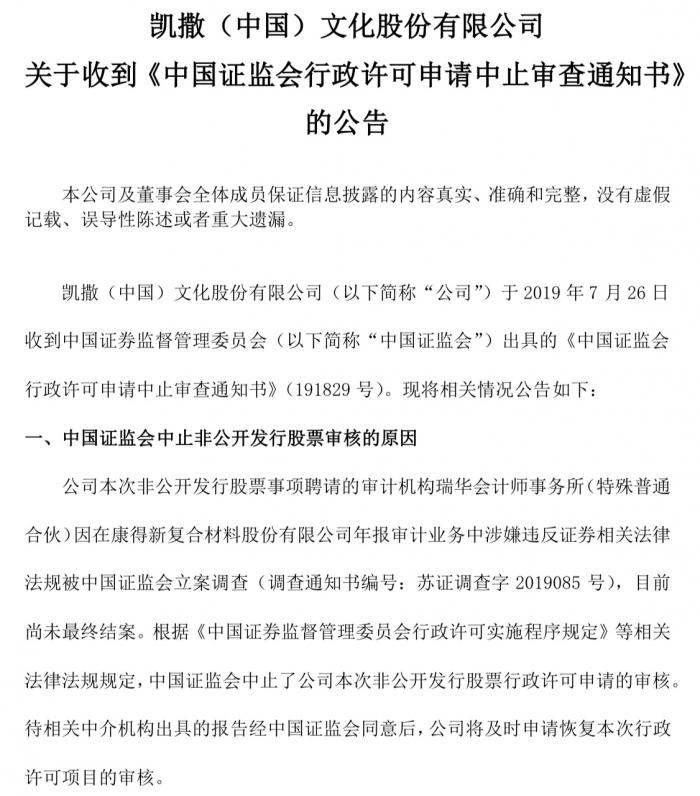 7月26日晚,凯撒文化、深南电路、泰禾集团、新北洋、庄园牧场、天汽模、蓝英装备均公告其再融资项目中止,原因都是同一个,即聘请的审计机构瑞华被立案调查。涉及的融资品种有定增和可转债。