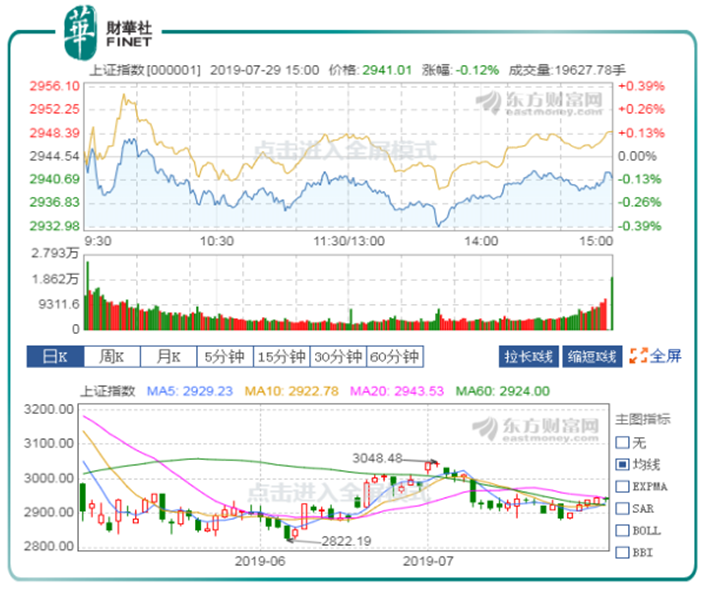 7月29日,沪深两市三大股指几近平开,早盘随着芯片等科技股的持续拉升,华为概念走强领涨,石墨烯、金刚石概念股盘中异动,三大指数小幅走高;但市场均缺乏较为持久的热点题材,证券持续低迷,上海自贸、农业股相对疲软领跌,随后指数冲高回落,三大股指也翻绿下行。临近上午收盘,指数稍显回升,其中创指翻红,沪指跌幅收窄。午后,三大股指呈现弱势盘整格局,创指表现强于沪指,但成交额仍处近期低位,资金观望情绪浓厚,个股跌多涨少。