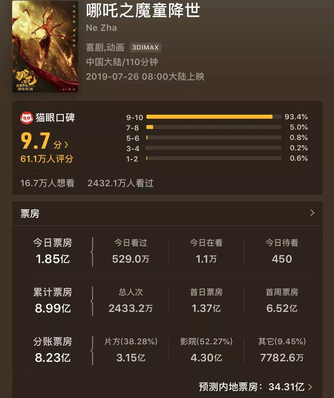 就在7月29日,猫眼专业版第四次上调了《哪吒》大陆票房的预期——34.31亿元。