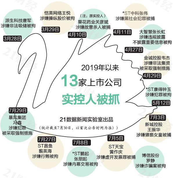 暴风集团的情况并非个例。据21数据新闻实验室统计,今年以来已有13家上市公司发生实控人被抓事件,单7月就已发生6起。博信股份罗静是唯一的女性。从具体原因来看,5起案例由实控人自身行为造成,5起为经济类犯罪,另有3起与证券市场有关。