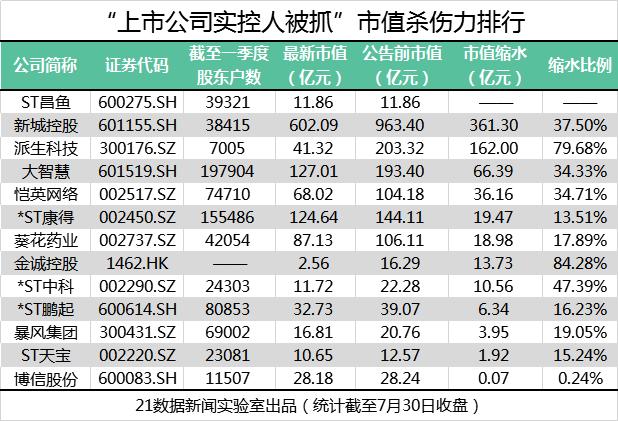 实控人爆雷成了上市公司市值的头号杀手。21数据新闻实验室统计发现,上述13家上市公司自首次披露实控人被抓的公告后,合计已蒸发市值高达700.87亿元,影响股民不止76万。