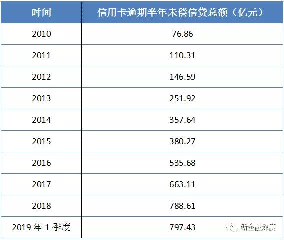 2019年7月,央行发布《2019年第一季度支付体系运行总体情况》,数据显示,信用卡逾期半年未偿信贷总额高达 797.43亿元,银行卡应偿信贷余额为 6.98 万亿元,环比增长 1.79%。