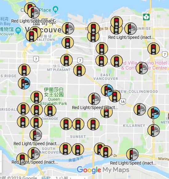 (温哥华市目前设有闯红灯和测速摄录机的位置)