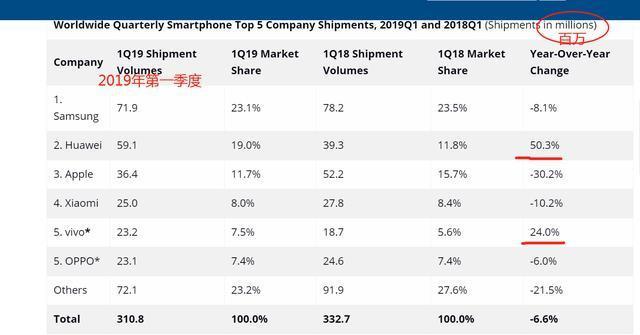 5月5日,全球四大智能数据统计机构IDC、Canalys、Counterpoint、StrategyAnalytics陆续发布了2019年第一季度全球智能手机市场的出货量排名。根据四家数据机构的报告来看,在2019年第一季度全球出货量排名第一的仍然是三星,华为则再次超过了苹果排名第二,苹果再次屈居第三。苹果iPhone则由于较高的定价以及缺乏创新性的卖点和功能,再加上其他中国手机品牌厂商的竞争,导致销量不佳,出货量仅为3640万台,同比大幅下滑了30.2%。