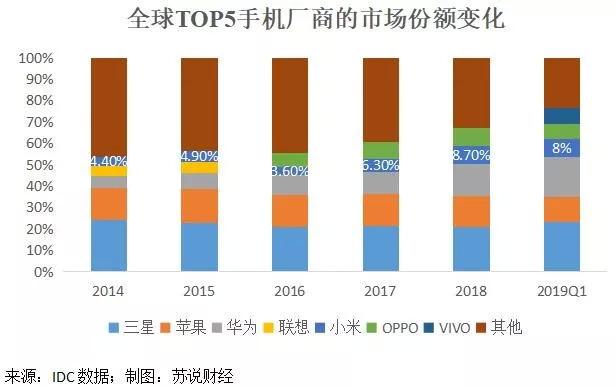 这场厮杀中,小米也不是一帆顺风,2016年是小米的低谷期。这一年,小米在全球市场掉出前五名,被IDC概括到了“其他”里;在国内市场被OPPO和VIVO超越,再也没能反超。但小米是唯一一个实现了销量下滑还能逆转的公司!2017年,小米重返IDC全球TOP5榜单,在国内市场也超过苹果;2018年,小米在全球的市场份额反超OV,2019年一季度也稳住了第4的地位。