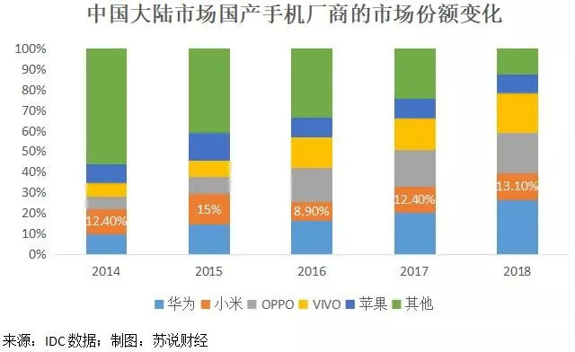 2014年是小米的高光时刻,也是全球手机厂商的分水岭。三星、苹果仍在全球大放异彩,但在中国大陆市场让位于国产品牌。2014年三星在中国大陆市场份额为12.1%,仅次于小米,位居第二。此后连年下滑,2016年“爆炸门”事件后,三星彻底丧失了中国大陆的市场,召回慢、态度恶,最终撤专柜离场,2017年市场份额跌为2.2%,2018年跌破1%。虽然三星发言人仍表示永不放弃中国大陆市场,但国人已经不买账了。2015年,苹果跨过巅峰后,也走向了销量下滑的艰难之路,在中国大陆市场的份额从2015年的13.4%降至2018年的9.1%,远低于OV、小米、华为。2018年,华为(市场份额14.7%)与苹果(14.9%)的差距再次缩小;2019Q1,苹果再次下滑,丢掉了全球第二的地位,华为取而代之,市场份额为19%,远高于苹果11.7%,略低于三星23.1%。全球TOP5手机厂商格局再改写。
