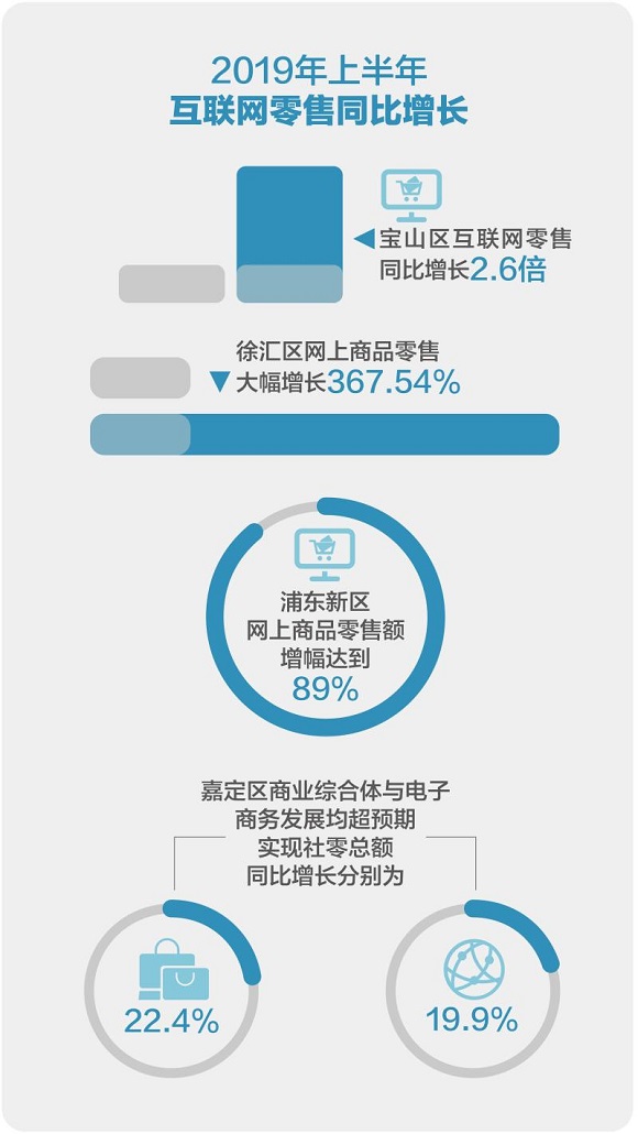 例如,虹口区大力发展“首店经济”和“夜间经济”,上半年引进全国首店25家,举办“活力街区·魅力夜市”等活动;静安区完善“全球新品首发地”核心功能,加强主街与后街联动,丰富提升消费体验;奉贤区打响东方美谷品牌,引入美国Costco品牌,打造以国内外一线化妆品和保健食品为主的东方美谷Costco全球精品体验店。宝山区互联网零售同比增长2.6倍,增速迅猛;徐汇区网上商品零售大幅增长367.54%;在盒马鲜生等新零售企业带动下,浦东新区网上商品零售额增幅达到89%;嘉定区商业综合体与电子商务发展均超预期,实现社零总额同比增长分别为22.4%和19.9%。