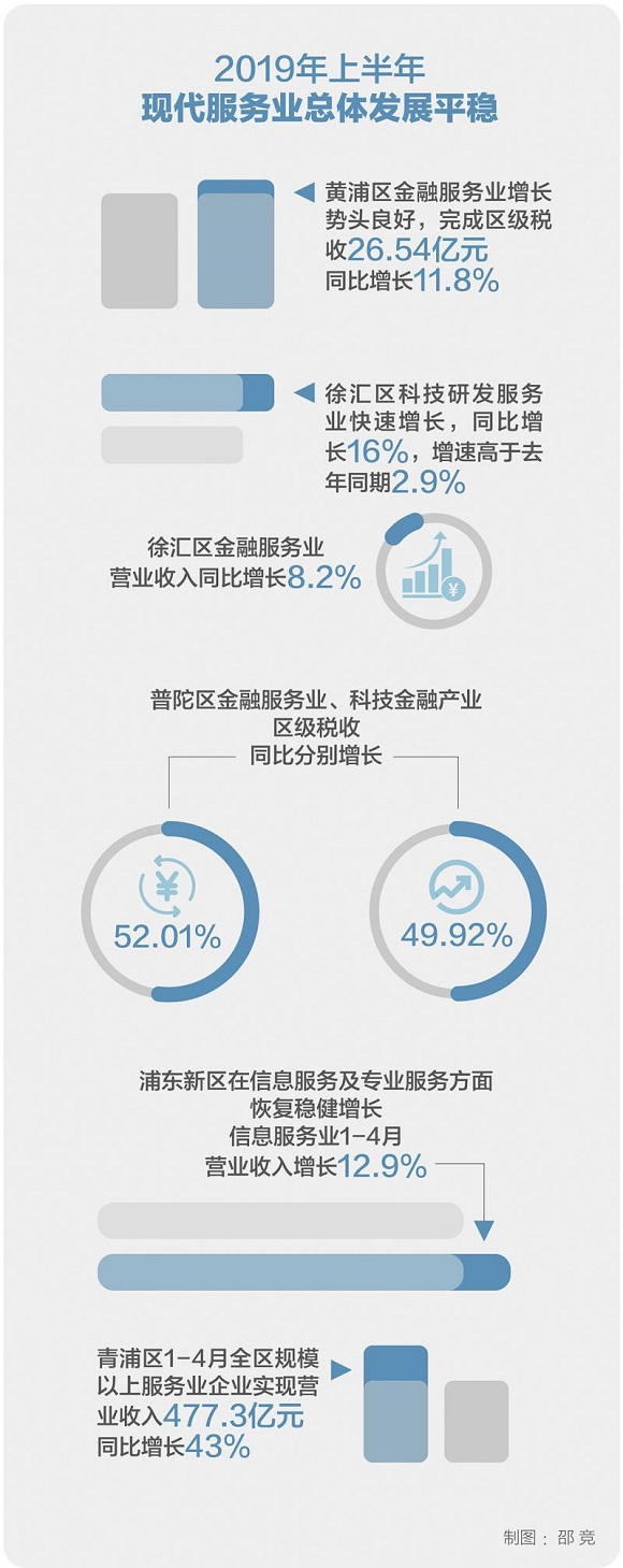 现代服务业总体发展平稳,金融服务、科技服务、信息服务等子行业呈现较多亮点。例如,受益于资管增长、股市回暖等因素,1-5月黄浦区金融服务业增长势头良好,完成区级税收26.54亿元,同比增长11.8%,资产管理业和信托业呈现大幅增长;徐汇区科技研发服务业快速增长,同比增长16%,增速高于去年同期2.9个百分点,金融服务业营业收入同比增长8.2%;普陀区金融服务业、科技金融产业区级税收同比分别增长52.01%和49.92%;浦东新区在信息服务及专业服务方面恢复稳健增长,信息服务业1-4月营业收入增长12.9%,法律服务、咨询调查和人力资源等行业保持两位数以上的快速增长;青浦区服务业上半年表现在郊区中较为突出,1-4月全区规模以上服务业企业实现营业收入477.3亿元,同比增长43%。