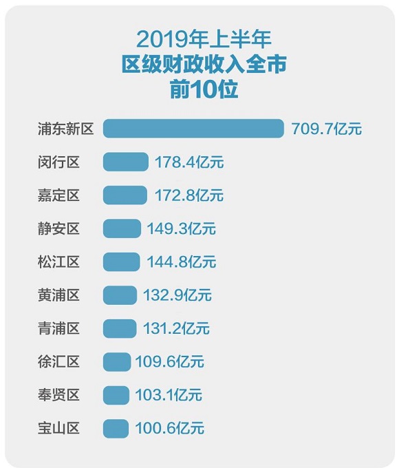 2019年上半年,区级财政收入排在全市前10位的是:浦东新区,709.7亿元;闵行区,178.4亿元;嘉定区,172.8亿元;静安区,149.3亿元;松江区,144.8亿元;黄浦区,132.9亿元;青浦区,131.2亿元;徐汇区,109.6亿元;奉贤区,103.1亿元;宝山区,100.6亿元。