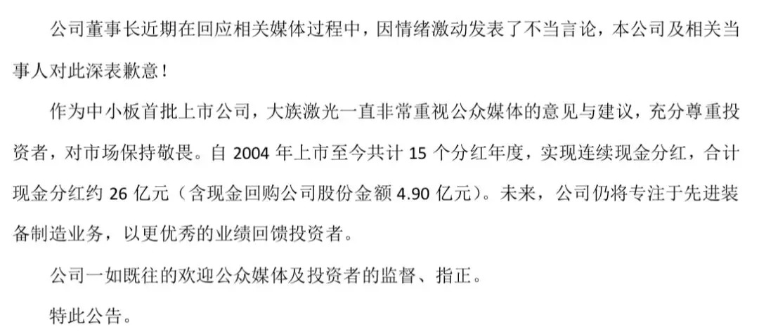 随后,大族激光也发表致歉声明,在深表歉意的同时,也称非常重视公众媒体的意见与建议,充分尊重投资者,对市场保持敬畏。