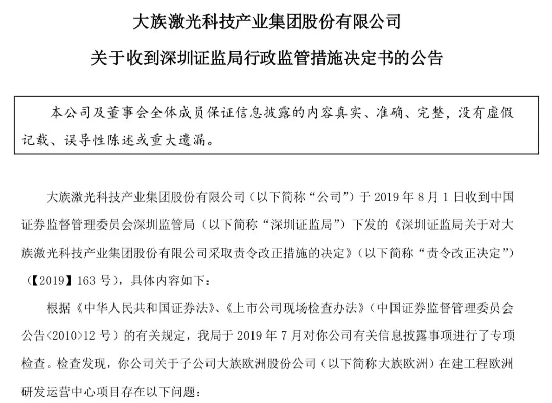 8月1日晚间,大族激光公告称,收到《深圳证监局行政监管措施决定书》。