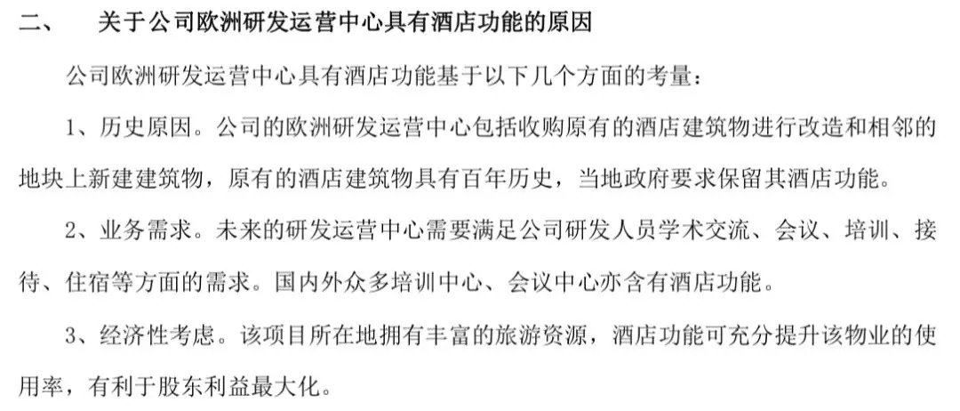 大族激光称,欧洲研发运营中心具有酒店功能主要源于三点考量,一是当地政务要求保留酒店功能;二是满足研发人员学术交流、会议、培训、接待、住宿等方面的需求;三是经济型考虑,酒店可提升物业使用率,股东利益最大化。
