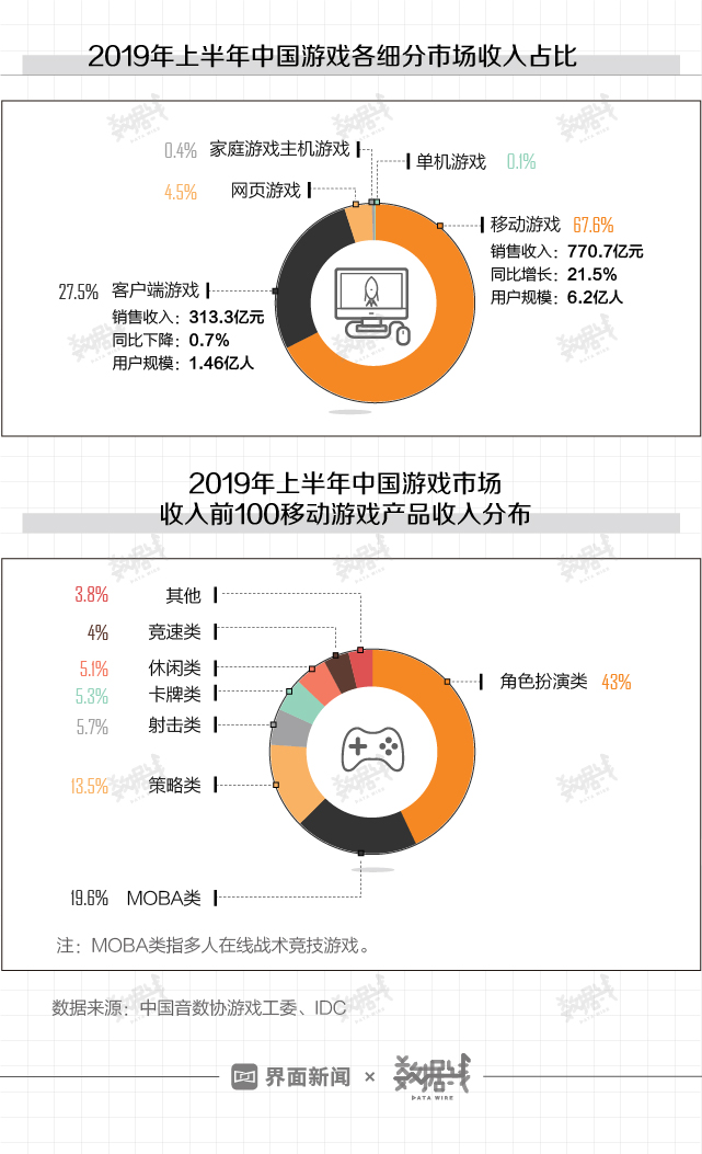 据中国音数协游戏工委和IDC数据,2019年上半年,中国游戏市场实际销售收入1140.2亿元,同比增长8.6%。截至2019年6月,中国游戏用户规模突破6.4亿人,同比增长5.9%。