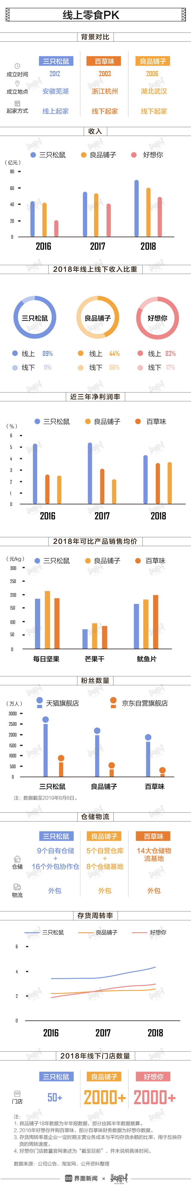从收入、净利润率、价格、会员数量和存货周转率上来看,起步最晚的三只松鼠最有优势。相反,良品铺子和好想你(2016年并购百草味)更注重线下布局,其线下门店数量均已超2000家。