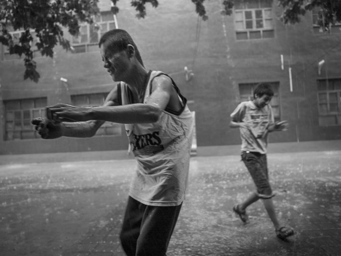 3. 在跑回宿舍的路上,男孩掉进了水池子里,浑身湿透。