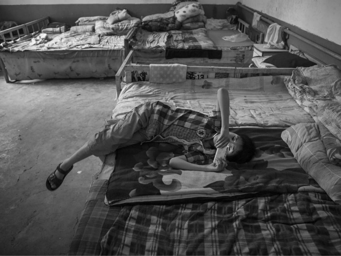 5. 小男孩正在宿舍里玩着手机。