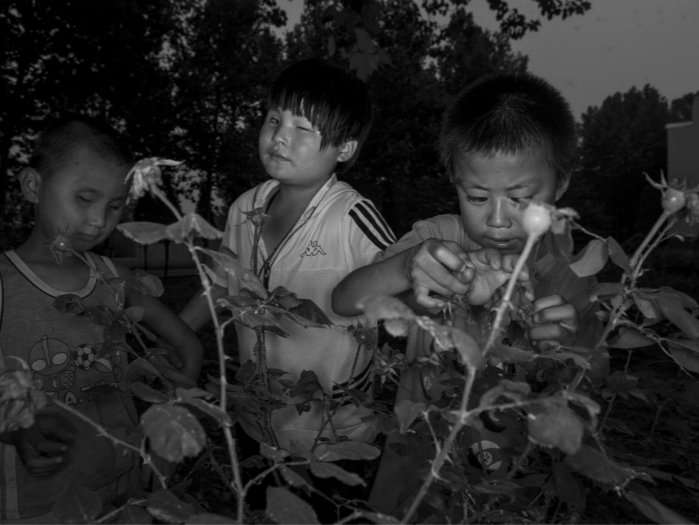 8. 尽管看不清楚,小男孩还是希望能让小伙伴感受一下玫瑰茎上的刺。 翻译:潘金花