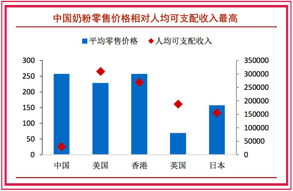 据欧睿数据显示,自2008年以来,国内奶粉价格年复合增长率为5.92%,从144元/罐上涨到256元/罐。这一价格水平相对于本国人均可支配收入已经明显处于世界前列,从绝对价格上来看,国产品牌奶粉的平均零售价格也远高于美日英等国。
