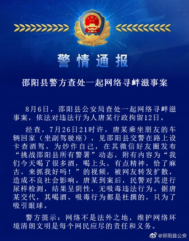 湖南省邵阳市邵阳县公安局通报,8月6日,邵阳县公安局查处一起网络寻衅滋事案,依法对违法行为人唐某行政拘留12日。