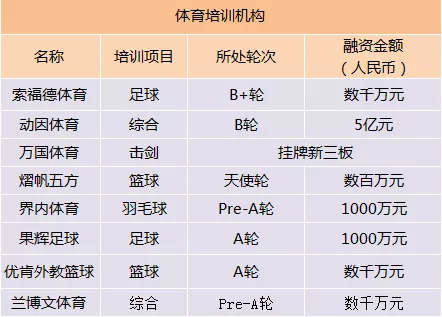 根据IT桔子公布的数据,部分已经在行业内比较成熟的体培公司其实还处在成长期,除了以击剑为主营业务,已经挂牌新三板的万国体育之外,其他例如以足球为主的索福德体育、综合培训的动因体育以及以篮球为主的熠帆五方最快也只进行到B轮融资,大部分企业还是在初创期。
