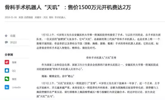媒体披露国产手术机器人的价格,因为研发难度大而价格不菲
