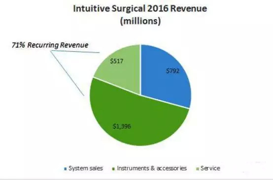 直觉公司2016年销售额7.92亿美元,其中最赚钱的是备件和耗材,占比50%之多