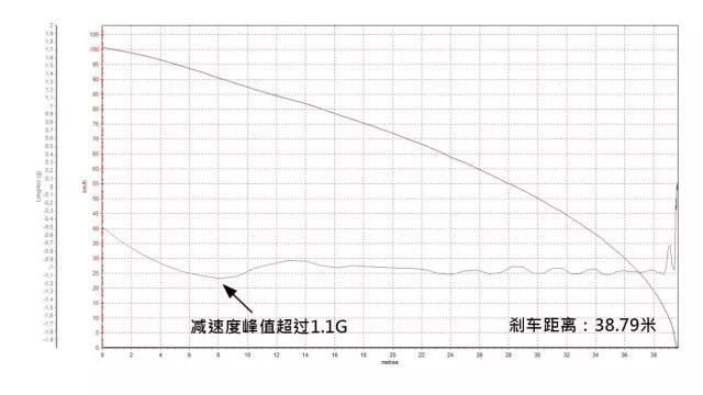 测试车装备了225/45 R17的马牌MC5轮胎,这款轮胎主打抓地力以及静音和舒适。在刹车测试和操控性的体验中,都给我留下了不错的印象。对于威朗而言,17寸的轮胎尺寸是外观和性能上的双赢。经过连续10次的全力刹车测试,威朗100-0公里/小时的冷刹车距离为38.79米,热刹车距离为39.03米。即使测试末期的制动系统温度很高,也没有出现明显的热衰减情况。下图为刹车曲线图,其中红色为速度曲线,灰色为减速G值,X轴为距离,Y轴为速度。