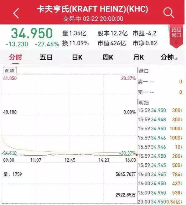 消息公布后,卡夫亨氏盘前股价大跌,今晚开盘后继续下跌,股价一度暴跌15%,市值缩水56亿美元左右,约合人民币400亿元。