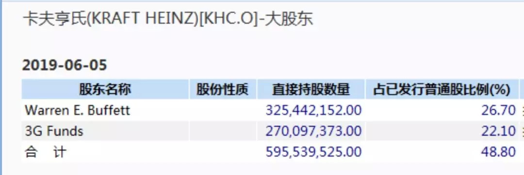 Wind数据显示,截至2019年6月5日,巴菲特仍然作为卡夫亨氏的第一大股东,直接持股数量达到3.25亿股,持股比例26.7%。