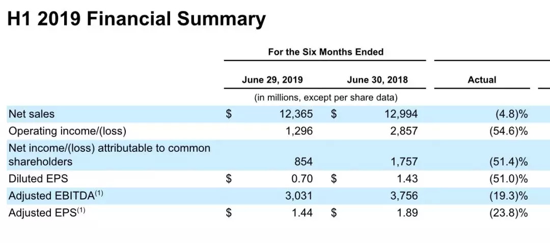 先来看一下卡夫亨氏2019财年上半财年的主要财务数据: