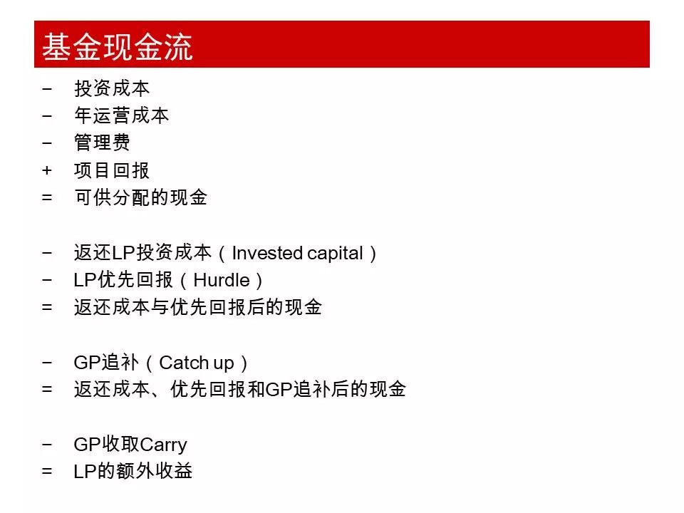基金得到的现金回报如同瀑布一般流下。瀑布下方从高到低排列着四个桶,瀑布的水只有在灌满了高处的水桶后才会继续向下流淌。最高处的桶是给LP的优先回报(Hurdle return),仅次于它的是GP的追补收入(Catch up);第三、第四个桶并排放置,一个是GP的Carry,另一个是LP的额外回报。