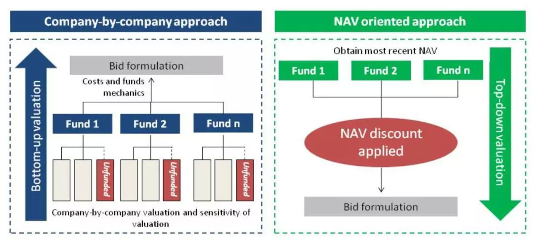 自上而下法也很少考虑资产的个别差异,虽然会尽可能地参考同类基金,但也无法考虑每一个底层项目的差异性。就算底层项目都是LBO或VC,个体项目之间也可能存在非常大的差异。自上而下法极少对这种个体差异进行量化处理,交易中容易出现价格争议。