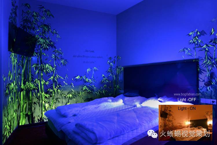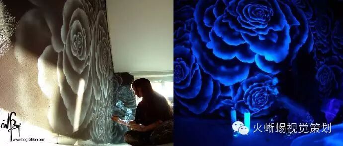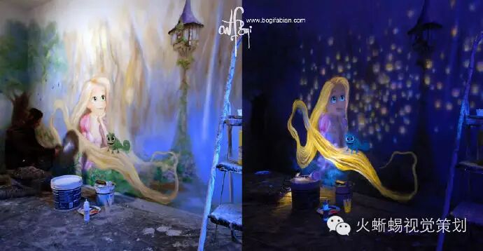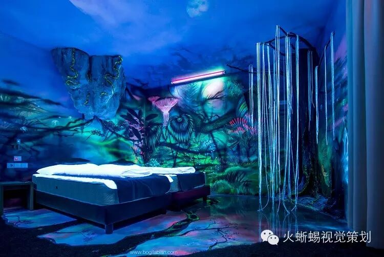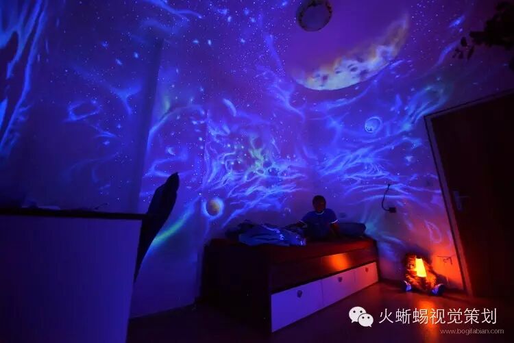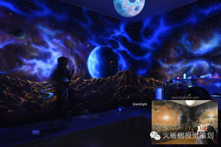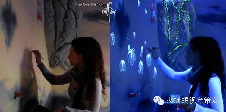 Bogi Fabian是一个年轻的欧洲艺术家,1984年出生在匈牙利,二十岁时定居在意大利。她的创作天赋往往让她有多种形式的艺术表现,而她的细腻特质则带给她一种深入研究的精神。她花了多年时间在绘画、雕塑、室内设计、人体彩绘等多个艺术领域进行一种“黑暗艺术”的探索,而这样的探索在室内壁画上尤为成功,她的作品与普通的艺术品完全不一样,不仅在白天看来美妙,在夜晚灯光熄灭后更炫目多变。