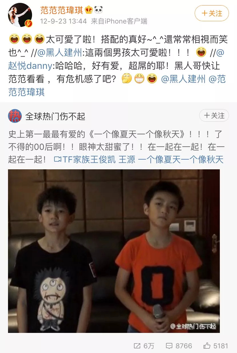 范玮琪转发王源和王俊凯的翻唱视频