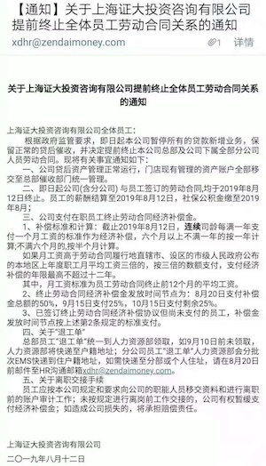 根据政府监管要求,即日起公司暂停所有贷款新增业务,保留正常的贷款催收,并决定提前终止公司总部及下属全部分公司人员劳动合同,暂停新增贷款后,公司贷后资产管理正常运行,各分店资产账户移交至总部催收部门统一管理。即日起,公司总部及分公司与员工签署的劳动合同均于2019年8月12日终止,员工薪酬结算至2019年8月,证大将支付在职员工终止劳动合同的补偿金。