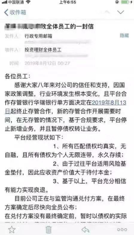 另据一份捞财宝平台员工内部邮件,捞财宝因国家政策调整、行业环境发生根本原因、银行终止存管合作等原因,平台决定良性清退。同时,捞财宝称公司的所有匹配债权均真实、应收资产价值大于待付本金,相信平台有能力实现良性退出,目前正在与监管沟通兑付方案。