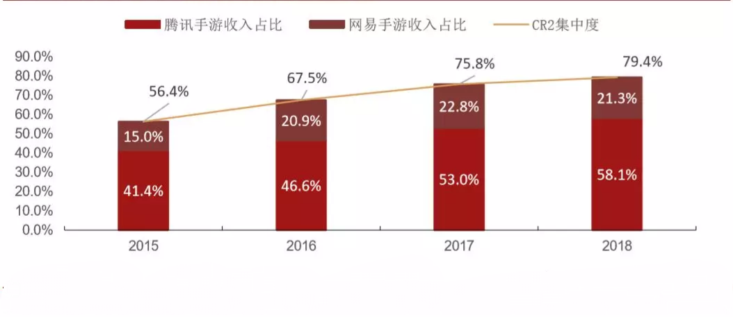 业务增速放缓除市场与自身原因外,腾讯的强势进攻抢夺市场也是重要原因。腾讯和网易作为国内游戏市场当之无愧的龙头企业,占据了利润丰厚的手游市场绝大多数份额,从2016年到2018年,网易和腾讯合计的市场占有率不断上涨,从68%、76%到现在的79%。但将两者分开来看,相较于腾讯游戏的良好发展势头,可以明显看出网易的市场份额增速呈现疲态。