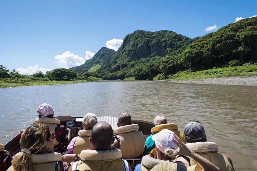 奇特的画面是,快艇往返在河里的时候,水中会时不时出现牵着牛过河的人,开始遇到三两次的时候,大家边热情地挥手打招呼边议论:这戏也太真了,河里还安排群演!后来遇到的多了,加上河两岸有零散吃草的牛羊,感觉这么布置群演的难度系数不断增大,我们换了议论的主题:这河里也没个红绿灯,快艇嗖嗖开着,水流也还有些急,不是当地人真不敢这么过,还牵着牛。