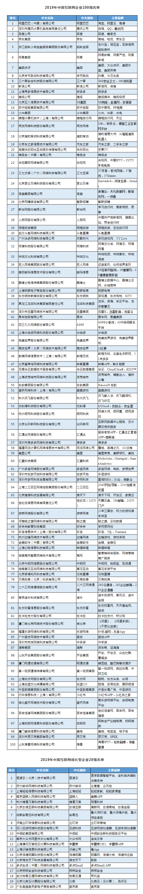 8月14日,中国互联网协会、工业和信息化部网络安全产业发展中心(工业和信息化部信息中心)在2019年中国互联网企业100强发布会暨百强企业高峰论坛上联合发布了2019年中国互联网企业100强榜单、互联网成长型企业20强榜单和《2019年中国互联网企业100强发展报告》。阿里巴巴(中国)有限公司、深圳市腾讯计算机系统有限责任公司、百度公司、京东集团、浙江蚂蚁小微金融服务集团股份有限公司、网易集团、美团点评、北京字节跳动科技有限公司、三六零安全科技股份有限公司、新浪公司位列榜单前十名。
