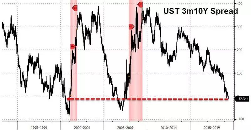 2019年3月22日,也就是美联储议息会议结束之后,3个月期、10年期美债收益率自2007年7月以来首次出现倒挂。