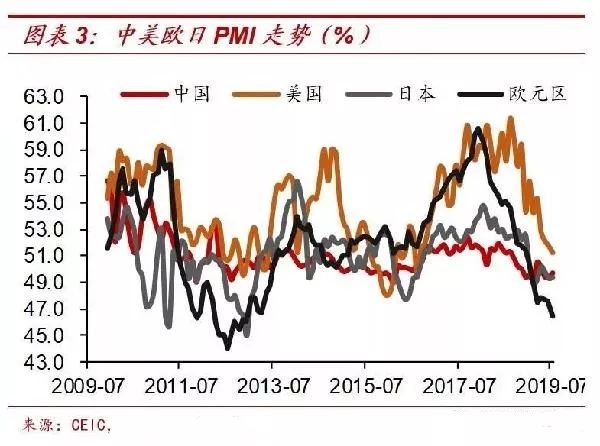 自2018年年初开始,全球制造业PMI开始从54.4%的高点,几乎一路下降至49.3%,跌至荣枯线以下,服务业PMI也同步回落。
