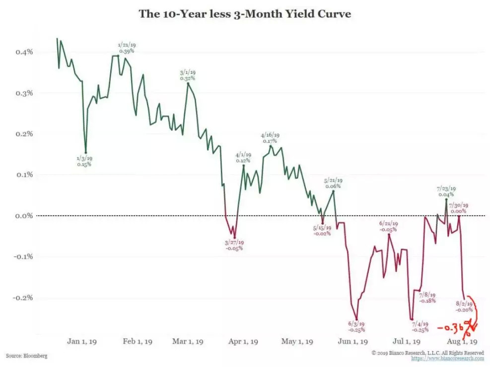 到8月份,倒挂已经持续了近两个月。3 个月和10年期国债收益率倒挂一度达到了36个基点,创出新低。