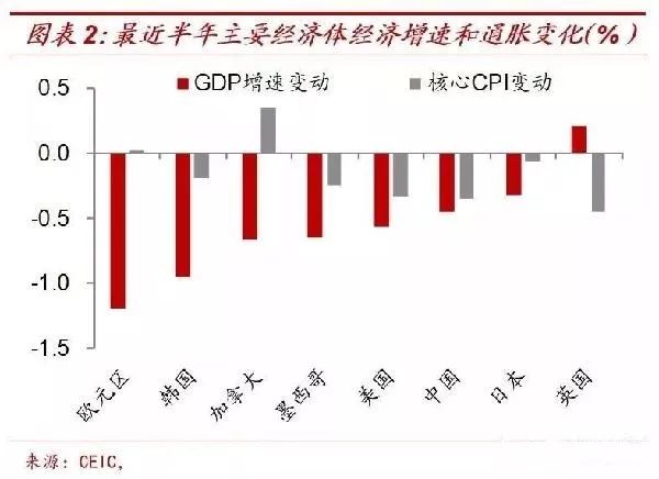 2019年上半年,全球几个主要经济体的GDP增速,除了英国同比略有回升外,中、美、日、欧、韩等都是集体下滑,尤其是欧元区经济增速直接腰斩!这些经济体的核心通胀水平相比去年同期也明显下降。