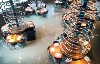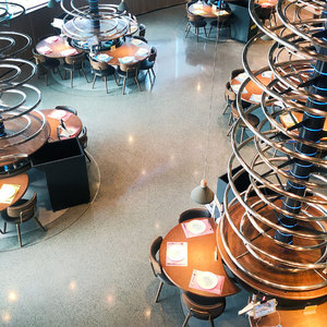 当然最抢眼的还是这些旋转向上的金属轨道、配合着蓝色的弧线形灯光设计和每个桌面都配备至少3台的ipad点菜设备,融合未来感与科技感。或许是为了打破轨道装置的刚硬质感,墙壁、桌面和座椅都是温和木质材料。